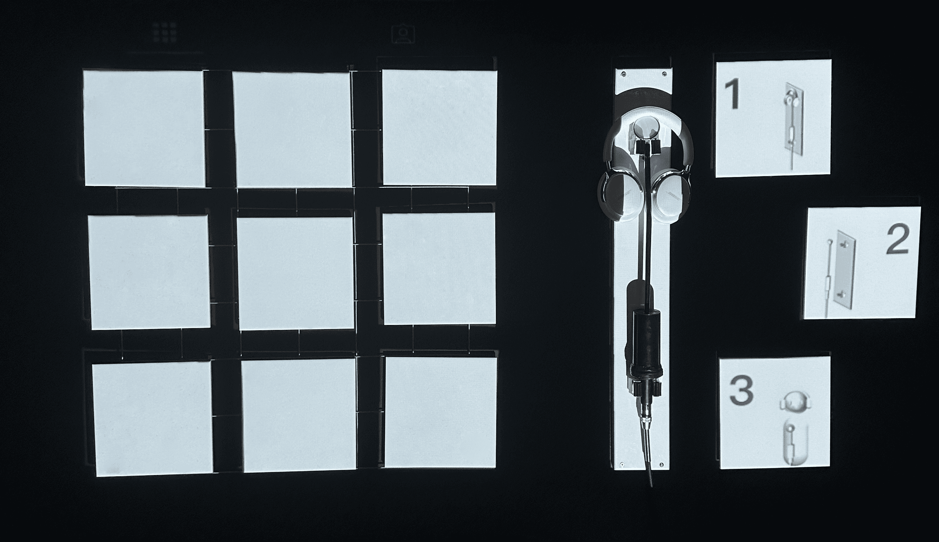 I simulated randomisation by creating a series of nine video playlists, each with the same set of videos arranged in alternating orders. I connected each of these playlists to sound—based triggering switches, so that with every heartbeat sound, a different video would be projected.